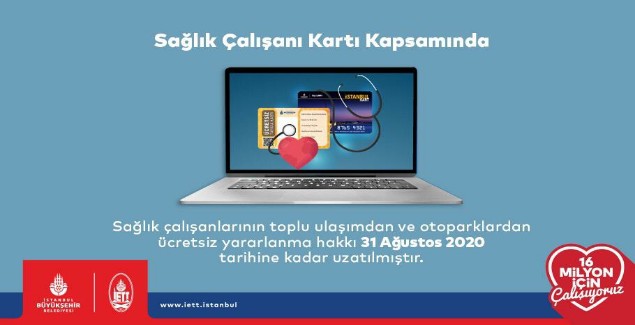 Sağlık çalışanlarının toplu ulaşımdan ve otoparklardan ücretsiz yararlanma hakkı 31 Ağustos 2020 tarihine kadar uzatılmıştır. Bu kapsamda Sağlık Çalışanlarına özel İstanbulkart dağıtımı devam etmektedir. Bugüne kadar 74.415 başvuru sahibine posta yolu ile kart dağıtımı yapılmıştır.